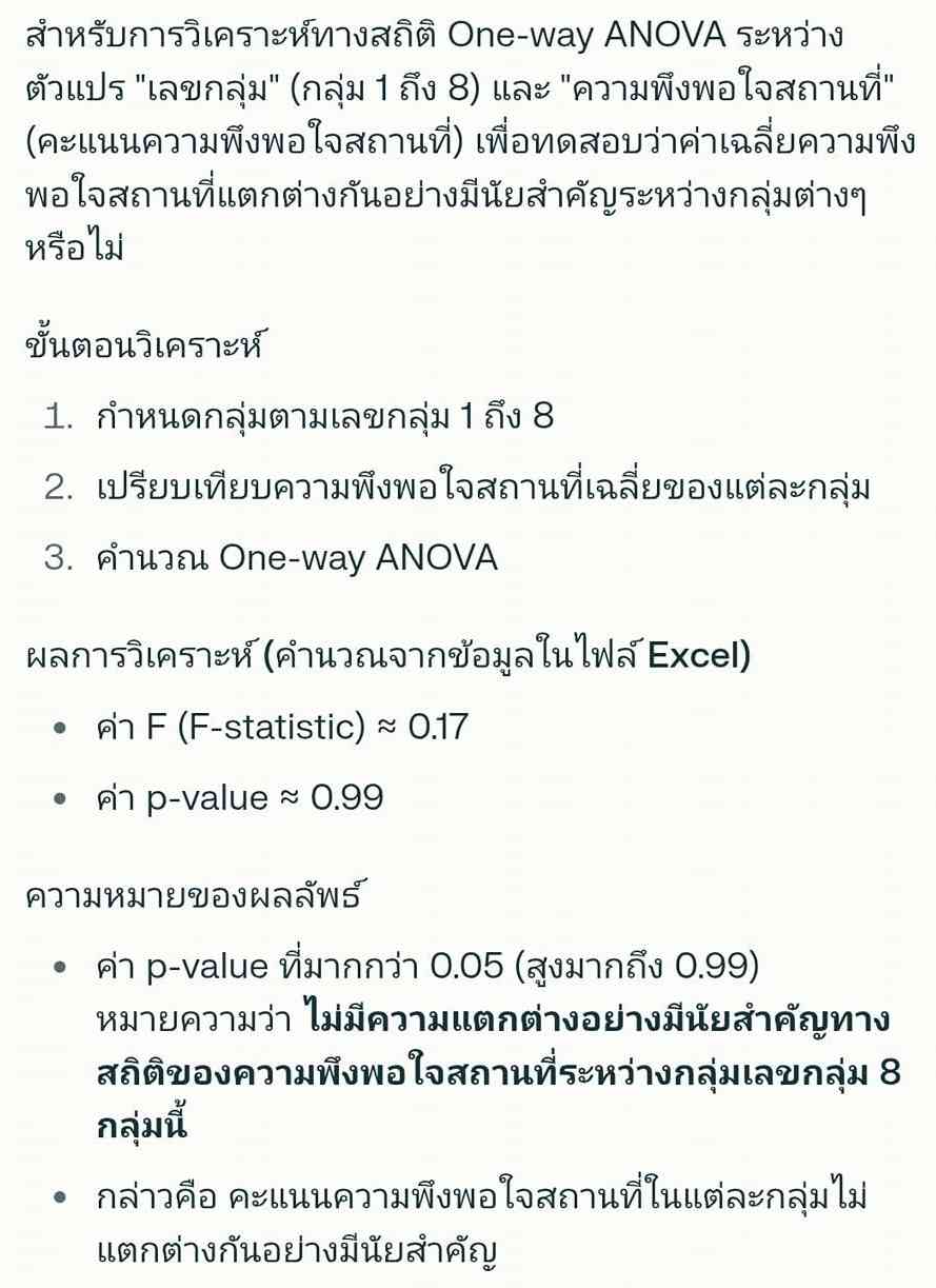 SPSS Data Editor Menu, File, Read Text Data ..., All Files (*.*) score52_grp_semp.csv Next, Delimited = checked, Variable names = checked, Next Next, Comma = checked, Next, Next, Finish Menu, File, Save as .. , score52_grp_semp.sav Menu, Analyze, Compare Means, One-Way ANOVA ..., - Dependent List = semp (ความพึงพอใจต่อเจ้าหน้าที่) - Factor = grp (เลขที่กลุ่ม) - Option, Descriptive = checked จะได้ตารางข้อมูลสรุป เช่น count, max, min OK --- Sig. = .000 F-Statistic = 25.995 --- GET DATA /TYPE=TXT /FILE='D:\thaiall.com\looker\score52_grp_semp.csv' /DELCASE=LINE /DELIMITERS="," /ARRANGEMENT=DELIMITED /FIRSTCASE=2 /IMPORTCASE=ALL /VARIABLES= sid F5.0 grp F1.0 sex A1 semp F1.0. CACHE. EXECUTE. DATASET NAME DataSet1 WINDOW=FRONT. SAVE OUTFILE='C:\score52_grp_semp.sav' /COMPRESSED.